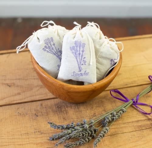 Hand stamped muslin bag, filled with 1/2 oz of fragrant dried lavender. Grown on our property, we hand harvest the flower buds from the classic French lavender hybrid 'Grosso'. A fragrant dark blue flower, with one of the strongest fragrances among lavenders. Great scent to freshen up your linens.